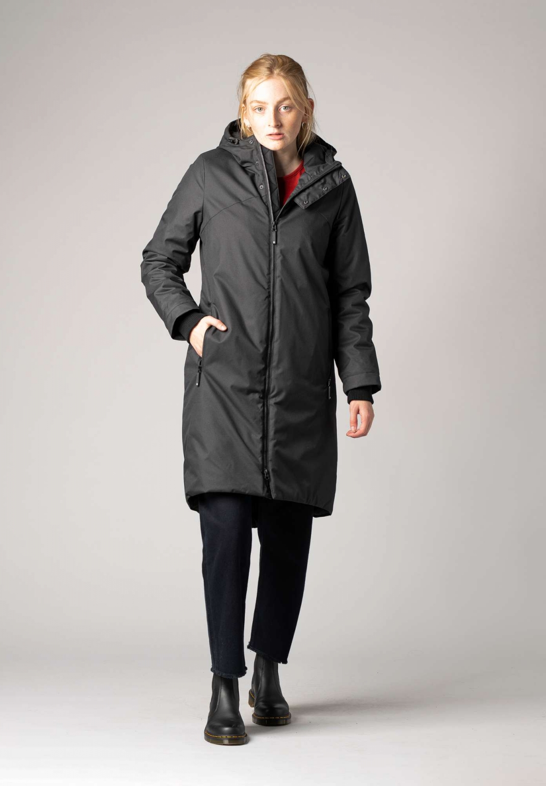 Piumino lungo pesante 200gsm per donna in Kapok, 100% etico e sostenibile, vegano. Esterno e fodera in nylon riciclato, secondo tessuto esterno 100% poliestere, imbottitura in 70% kapok, 30% poliestere riciclato. Morbido