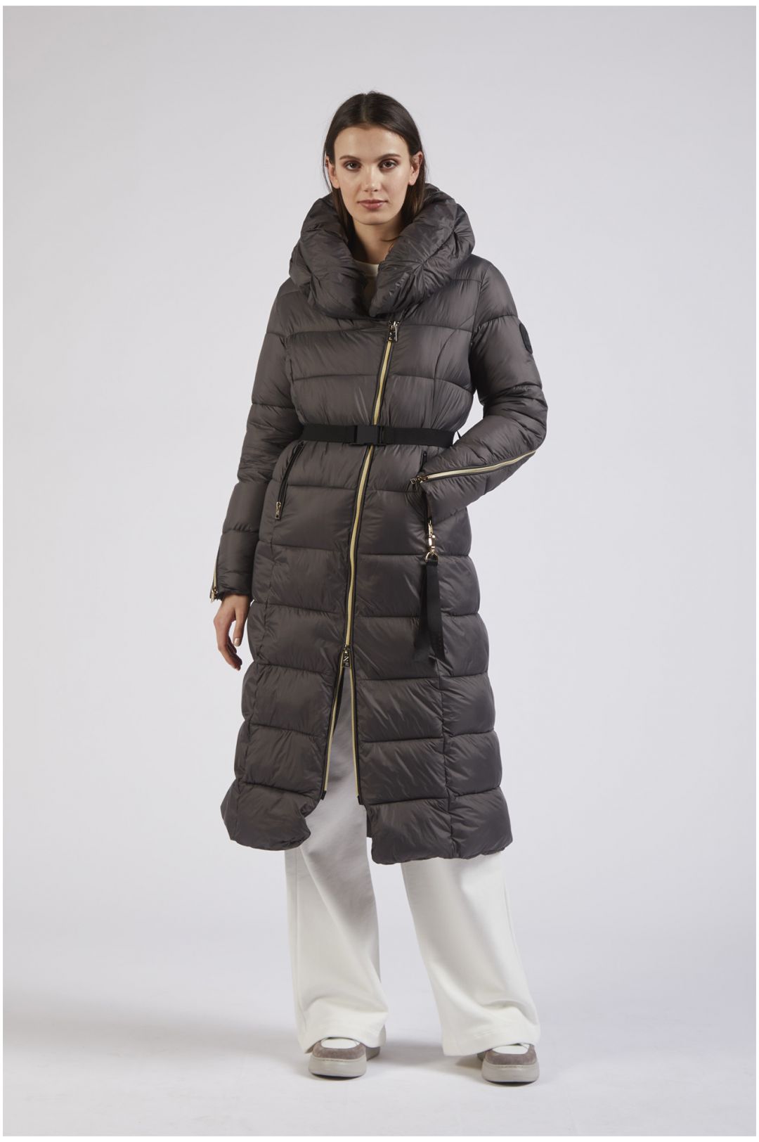 Piumino con cintura elastica e collo avvolgente