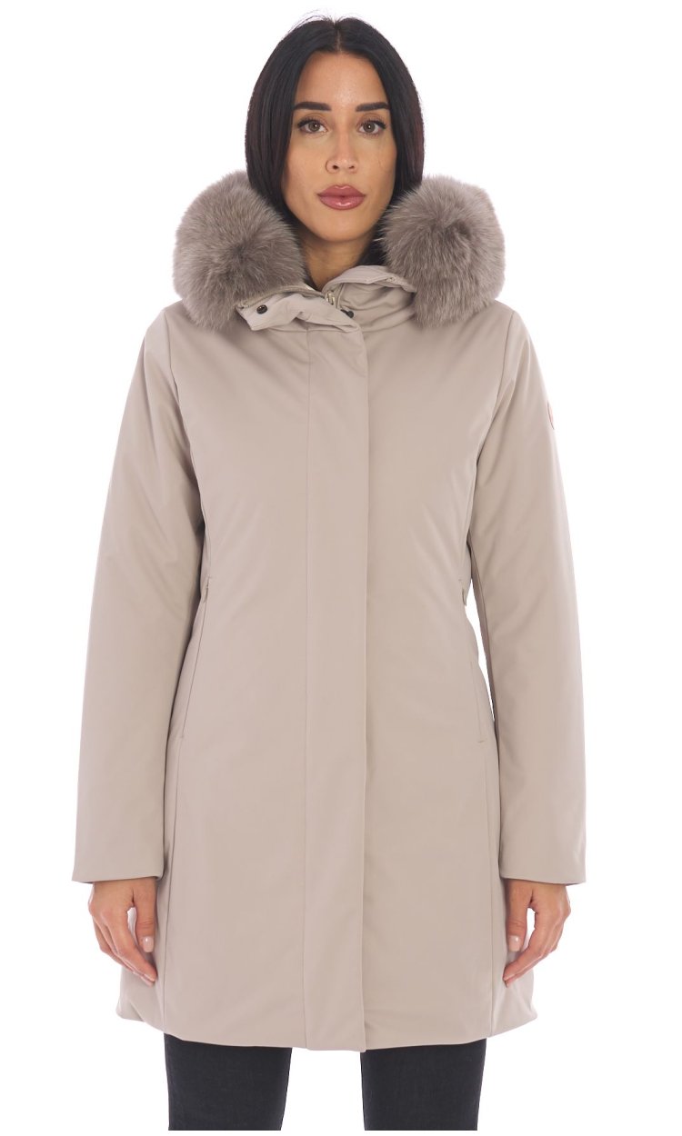 Piumino lungo People of Shibuya donna liscio con cappuccio e pelliccia AEMI
