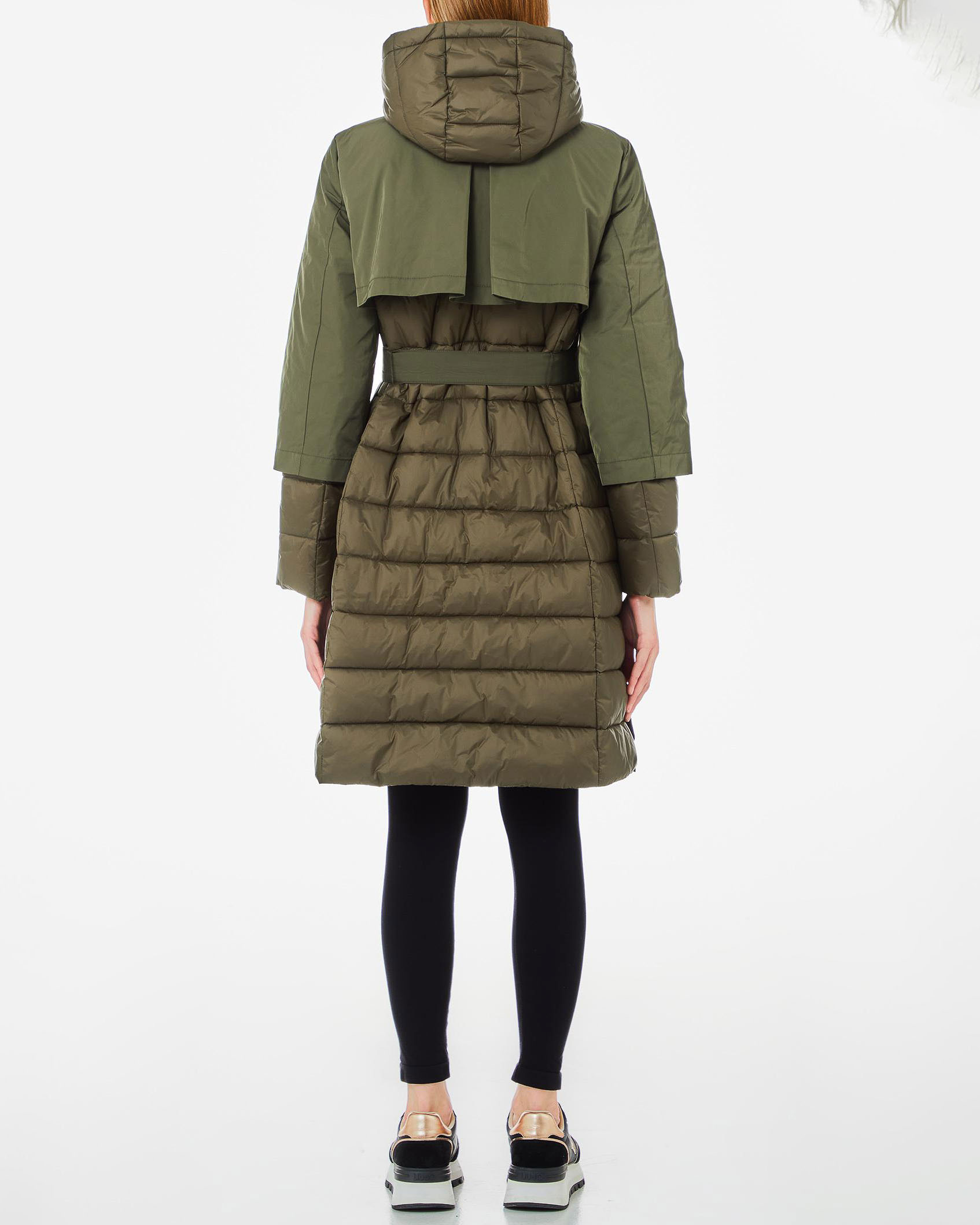 Piumino lungo con cappuccio verde militare in nylon con davanti stile trench logato rimovibile