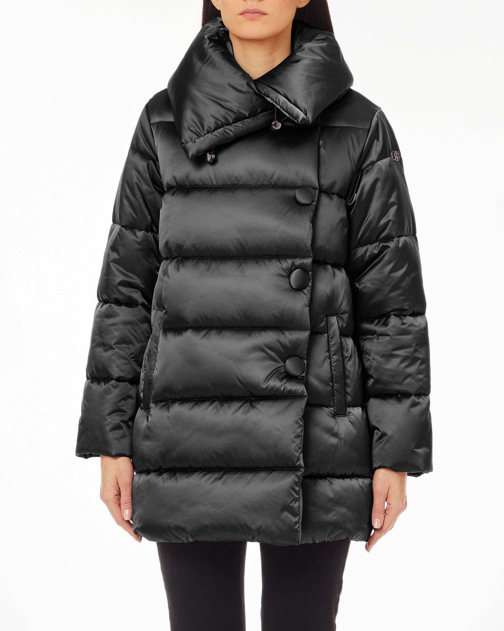 Piumino midi nero effetto semilucido con collo alto avvolgente e chiusura laterale