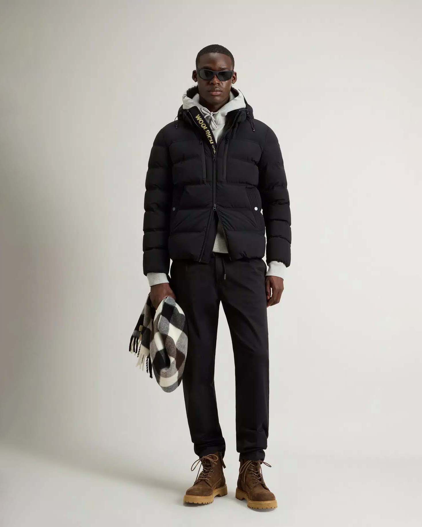 Piumino Matt Woolrich nero in nylon stretch opaco con cappuccio staccabile