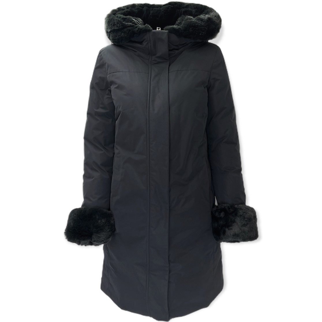 Woolrich donna piumino lungo nero con bordi in pelliccia sintetica e zip